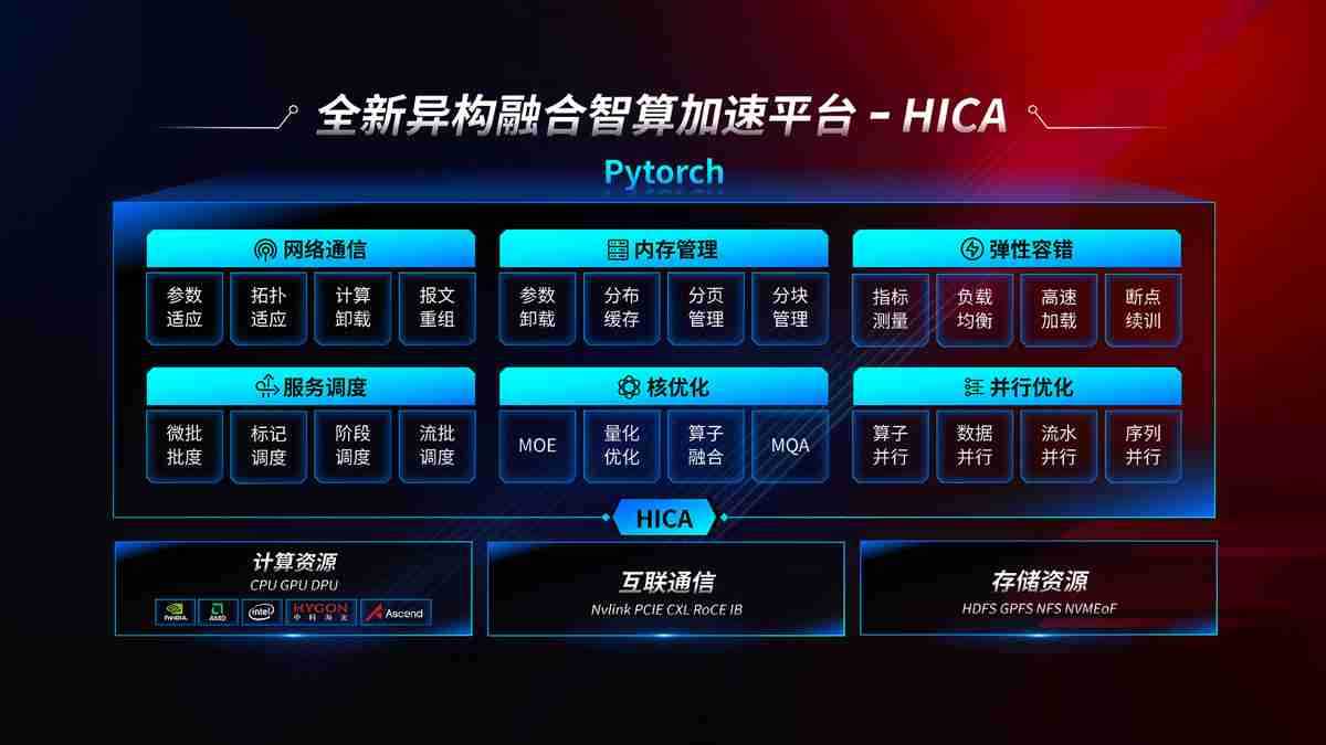 通过自研的服务层、、、、中间适配层、、以及调度编排算法,,,,采用数据并行、、、、模型并行等多种并行方式,,把并行计算任务进行有效的分解,,,使其分别由相应的软件栈和算力资源来承接。。。。当GPU资源变化,,,,HICA可以实时动态调度计算子任务并调整模型拓扑和架构,,,,以充分聚合各种算力资源。。。