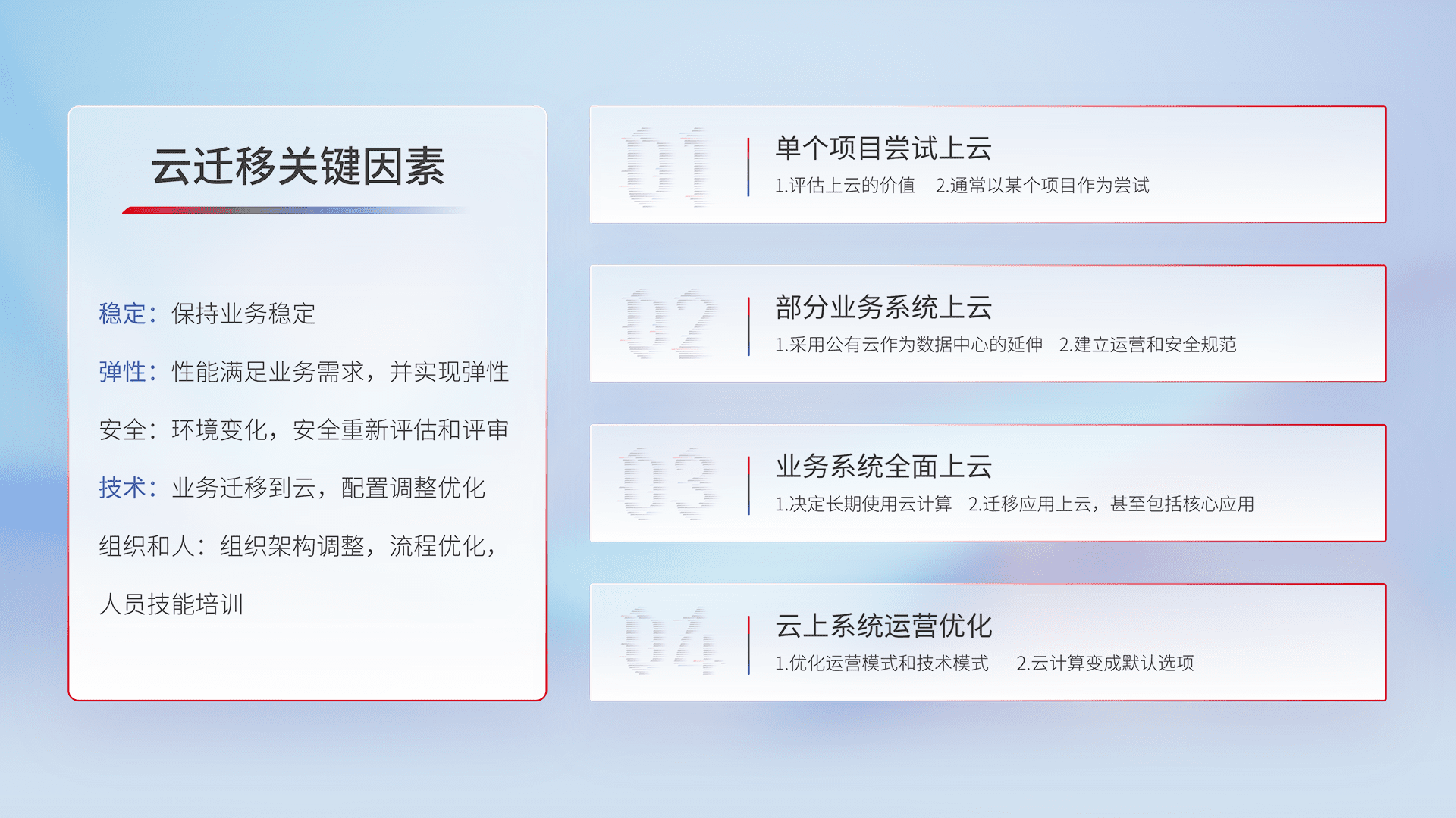 结合实际业务,,,从规划设计、、、、云平台选型、、、、云原生改造、、、数据迁移、、、集成交付,,,迁移全过程为客户识别最佳上云路径,,做好风险识别管理,,,,设计网络架构、、、、身份权限、、、安全审计合规、、、、操作审计、、、日志审计、、、监控告警策略、、多站点容灾设计等,,对云上基础设施进行整体规划,,,,提升IT治理水平,,,,以满足弹性、、、、高可用、、、高性能的需求。。。。