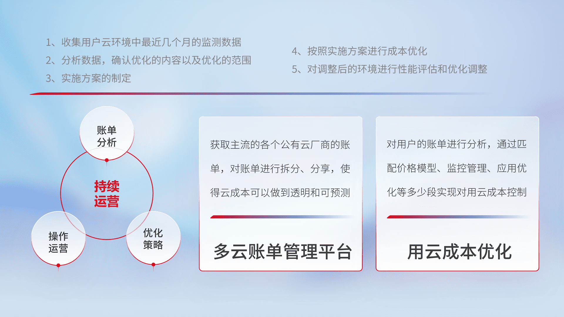 通过多云纳管,,,,以统一的资源数据模型把客户的云资源进行抽象和封装,,进而实现对多云资源的统一操作,,,保障云资源管理的可靠性、、、、稳定性与可用性。。量身定制化运维内容,,配置、、开发运维、、补丁管理、、、备份、、、监控、、认证和访问管理、、、审计和日常巡检等,,,保障在用云过程中的可靠度,,,,稳定度以及高可用率。。。。